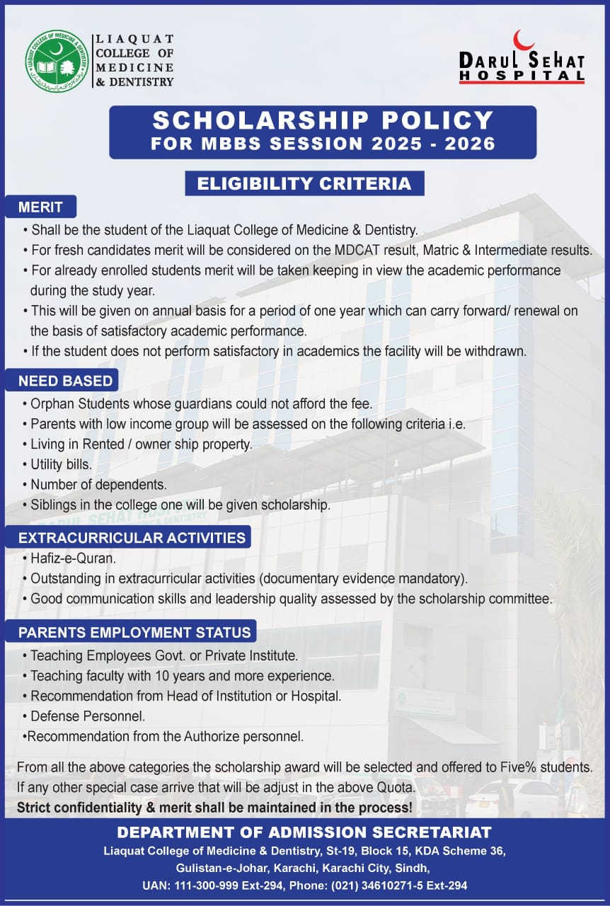 LCMD awards scholarships and Financial Aids to student on Merit cum need basis (as per PMDC policy). All kinds of discounts, waivers, scholarships and financial aid are applicable to tuition fee only.