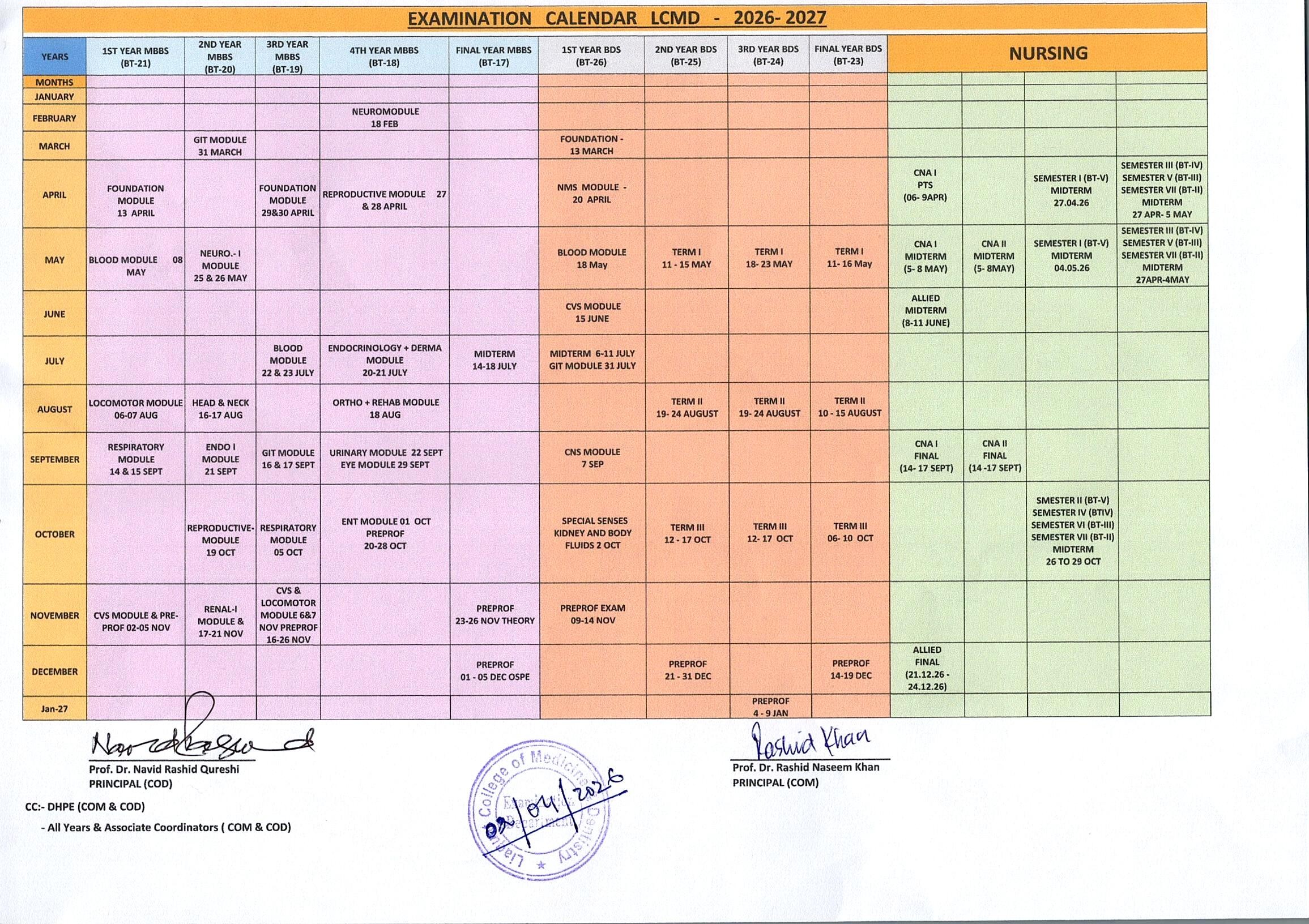 Examination Department announces its yearly examination calendar at the start of the session for students and faculty.